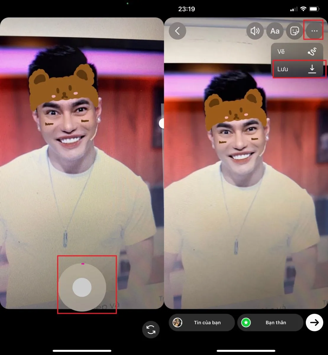 Bước 4: Nhấn giữ nút tròn ở giữa để quay video TikTok bằng filter Instagram, khi bạn muốn dừng quay chỉ cần thả tay. Sau khi quay video xong, bạn hãy bấm vào biểu tượng ba dấu chấm trên góc phải màn hình rồi bấm Lưu để tải video về điện thoại.