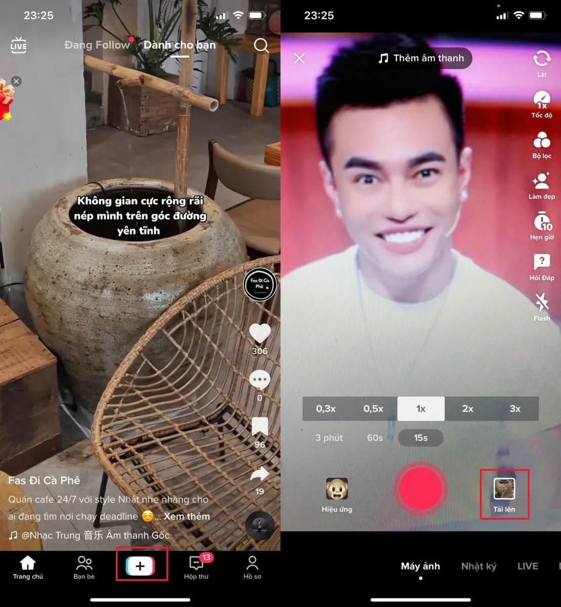 Bước 5: Mở ứng dụng TikTok ra và chọn Camera. Sau đó bạn bấm vào nút Tải lên bên góc phải màn hình để tải video vừa quay bằng filter Instagram lên TikTok.