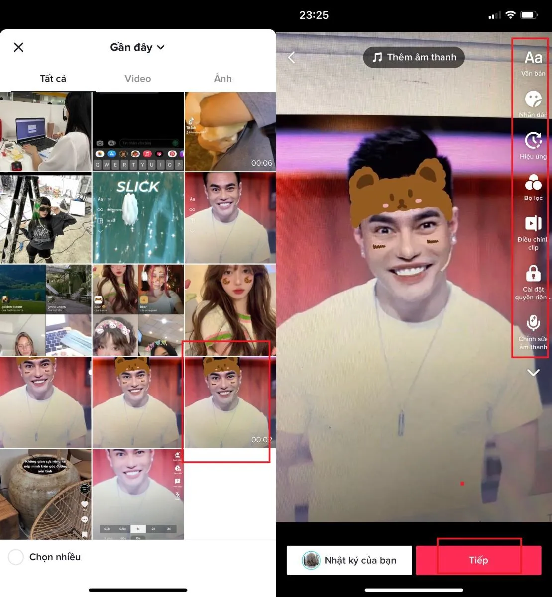 Bước 6: Chọn video bạn muốn tải lên. Tại đây bạn có thể sử dụng các công cụ mà TikTok cung cấp để chỉnh sửa video như thêm bộ lọc, cắt ghép video, thêm âm thanh… Sau khi hoàn tất việc chỉnh sửa, bạn bấm Tiếp.