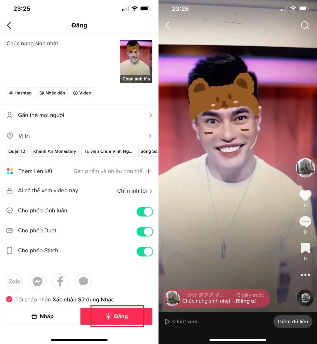 Bước 7: Tiến hành ghi đoạn mô tả cho video, thêm hashtag TikTok và gắn thẻ bạn bè của bạn (nếu có). Cuối cùng bạn bấm nút Đăng để chia sẻ video lên trang cá nhân TikTok của mình.